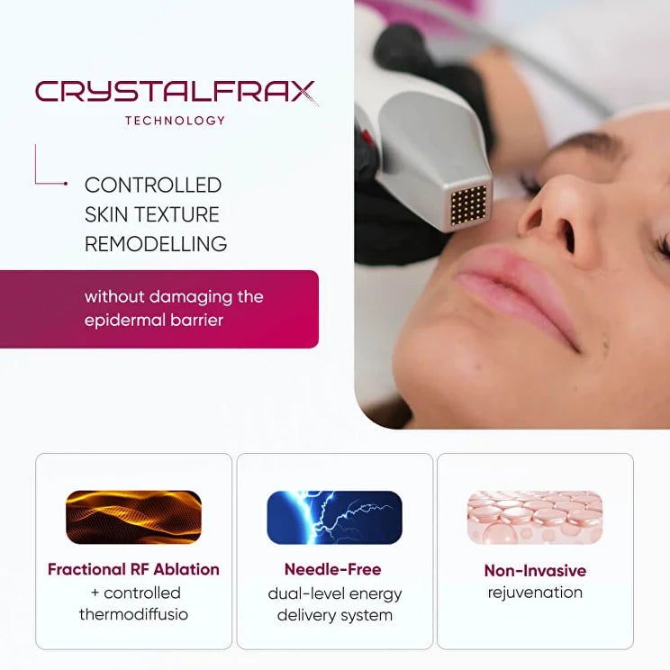 The CrystalFrax MD Pro RF Treatment is an innovative radio frequency treatment designed to support collagen renewal, improve the appearance of firmness, and refine overall skin texture. This comfortable, non-surgical technology gently warms the deeper layers of the skin to encourage collagen production for a smoother, more lifted and revitalised complexion with minimal downtime.